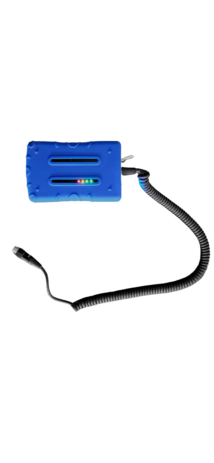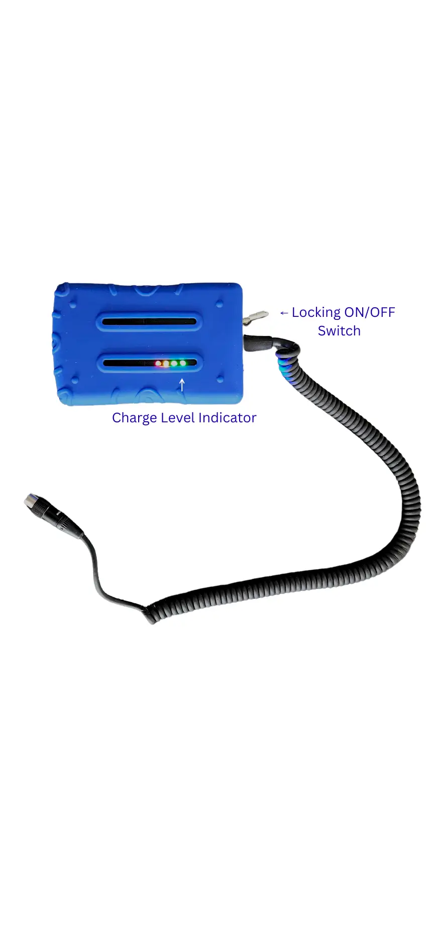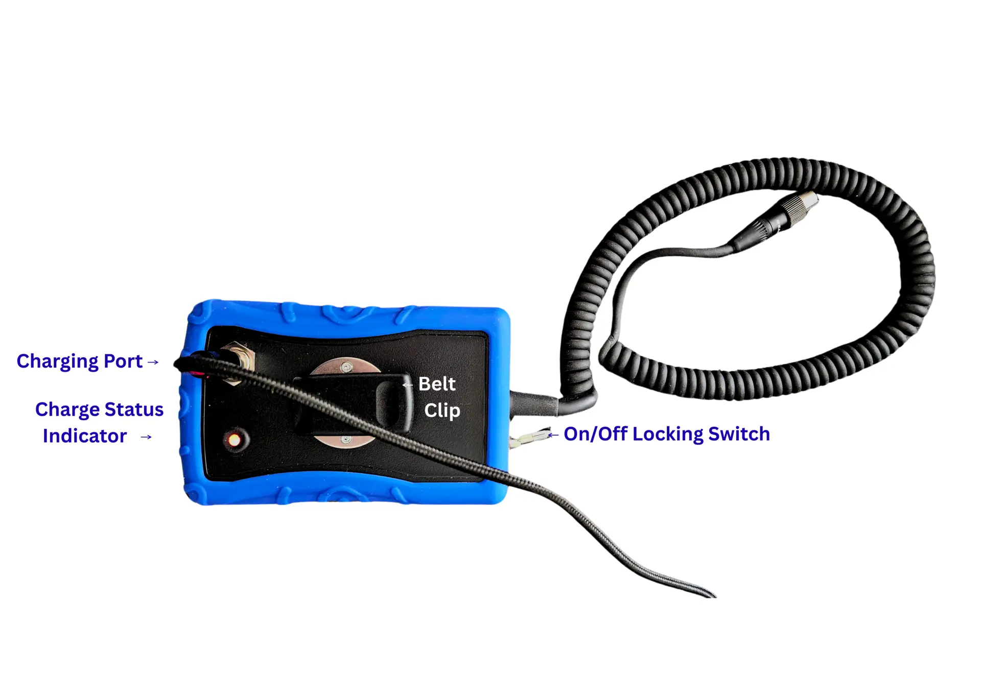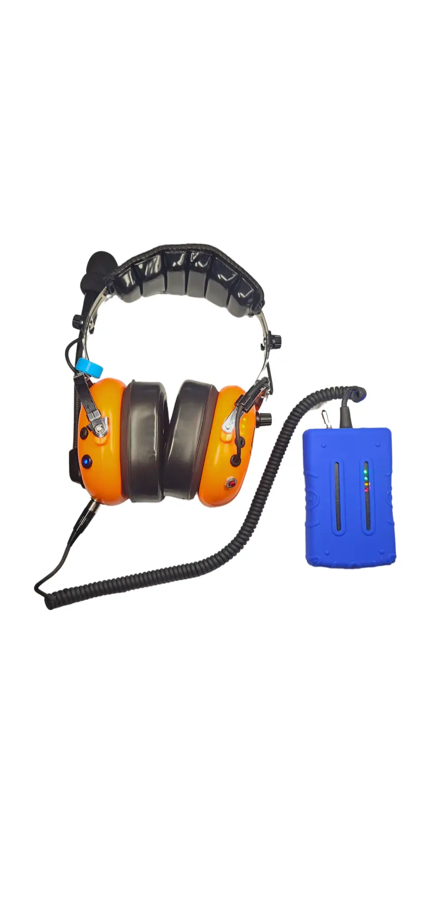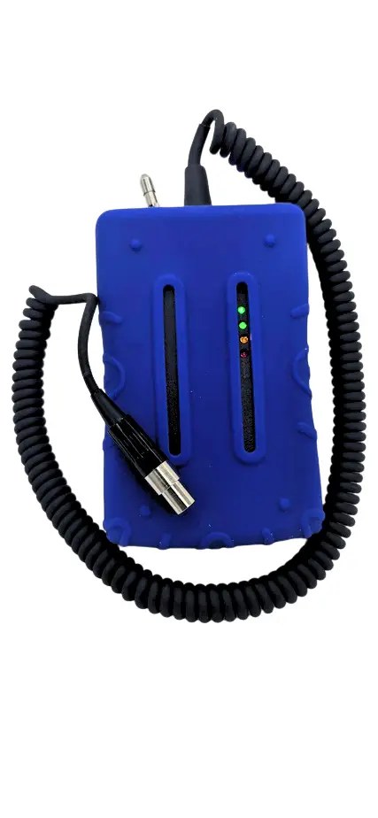 It is ruggedized for airport use, waterproof, includes battery indicator lights. The locking on/off switch to prevents accidentally turning it off. This feature prevents accidental discharge when it’s not plugged into a headset, like if it was dropped in a puddle for example.