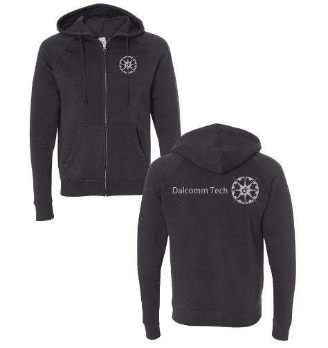 The new Dalcomm Tech Independent Black Zipper Hoodie with Dalcomm Tech logo screen printed on the front and screen printed Dalcomm Tech text with logo on the back. It is not only comfortable, but it is well made and durable. We can vouch for that because we wear ours every day! Â Available in S, M, L, XL, and XXL sizes.