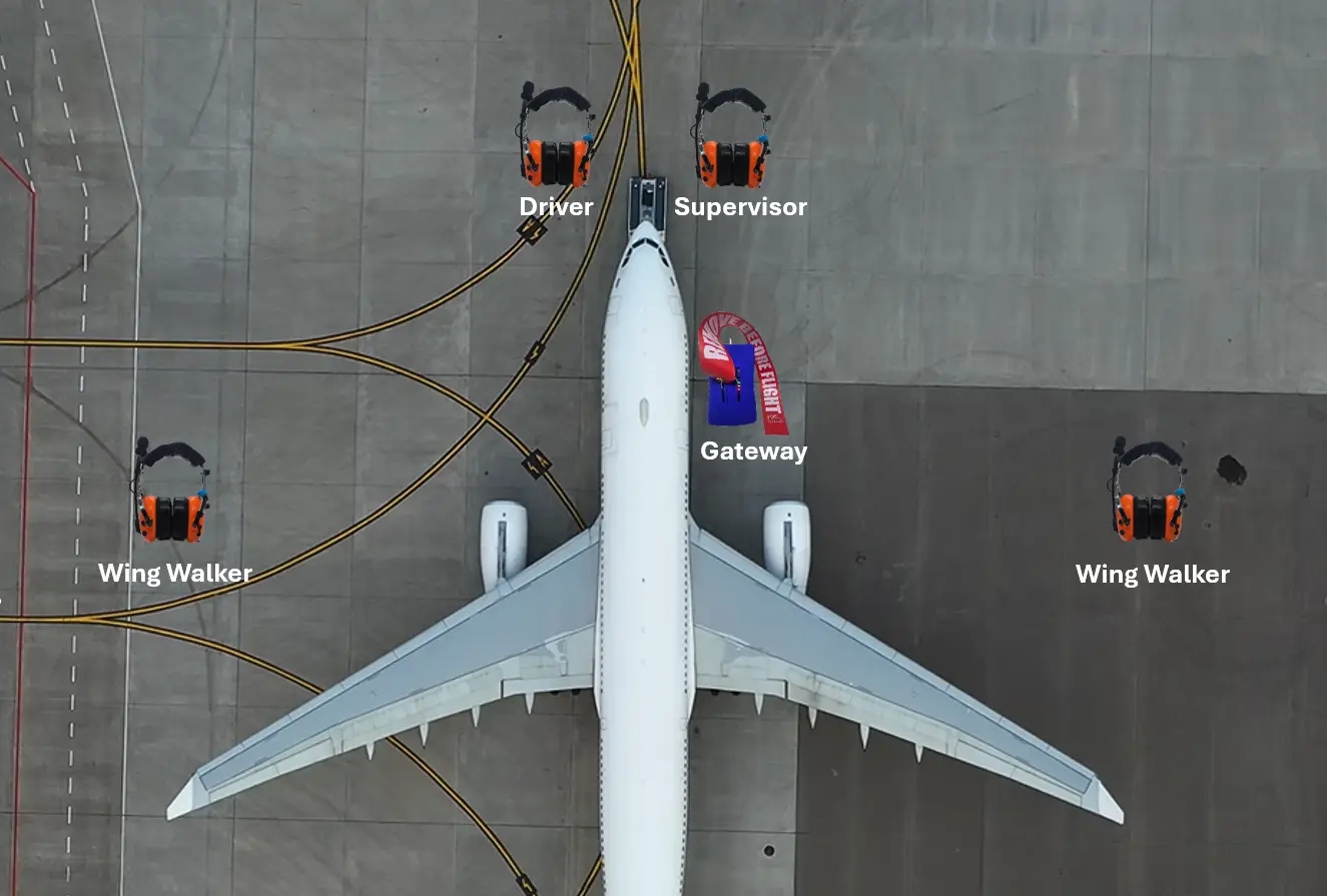 The Dalcomm wireless intercom is a set of headsets that can all talk to each other wirelessly and a gateway that connects to the aircraft external intercom jack so the intercom gets tied into the wireless workgroup. That allows the pushback driver headset to be able to transmit to the flightdeck. All headsets can hear the flightdeck at all times.