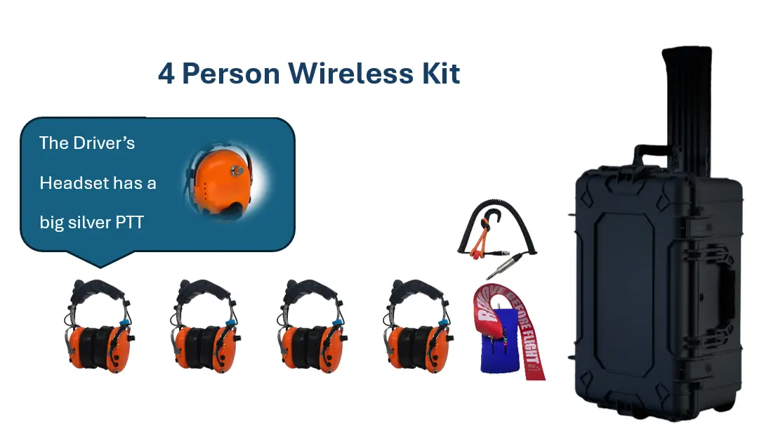 Inside the case with wheels you will find two wing walker headsets, one pushback driver headset, an additional wing walker style headset for a supervisor, and one gateway. The case has a built in charging system and an extension cord to plug the case in.